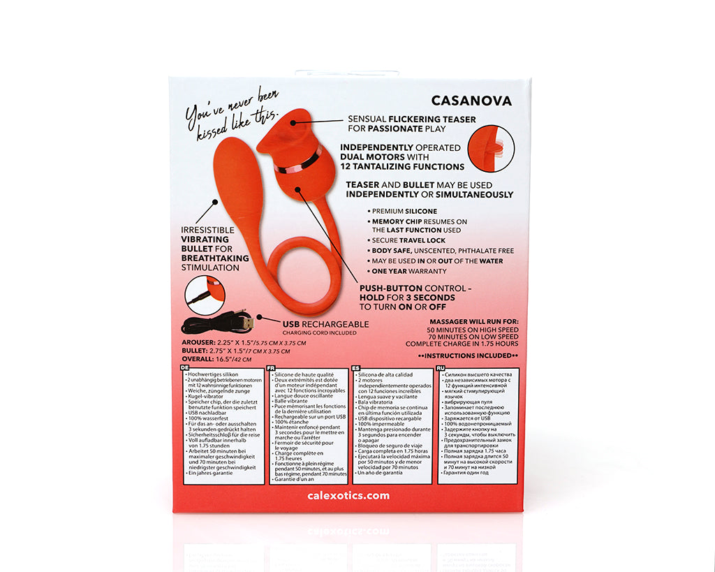Oh Casanova! The sensual French Kiss™ Casanova is an irresistible flickering teaser with a powerful vibrating bullet made truly passionate playtime. This powerful vibe will show you true ecstasy with every flicker of the tongue teaser, dual vibe motors and 12 functions of vibration.